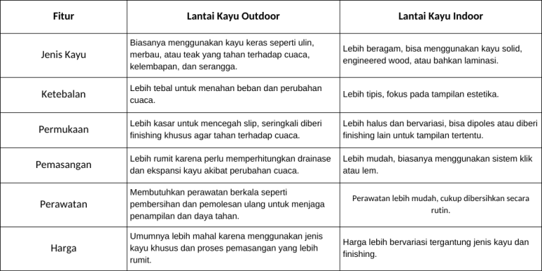 - Anggaran: Berapa budget yang Anda siapkan? Lantai kayu outdoor umumnya lebih mahal.